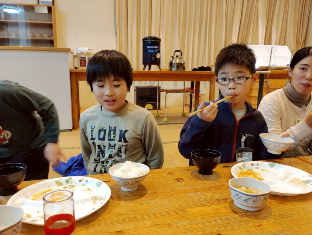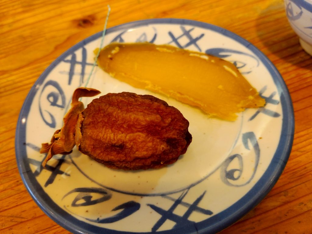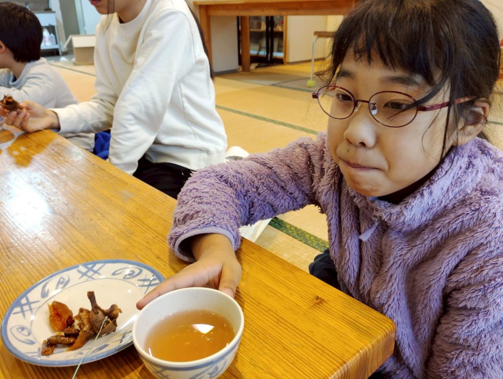 利賀で作られた干し柿と干し芋、クロモジ茶を味わいました。それぞれのおやつを見たのが初めての子もいたようで、おっかなびっくり口に運ぶと、「おいしい!」「甘すぎで苦手かも…」とそれぞれの反応を見せていました。