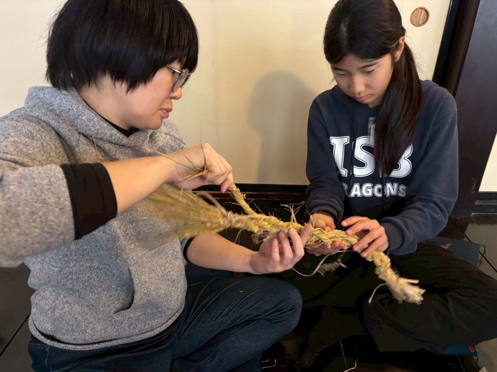 お昼のあとは、正月飾りのしめ縄づくりを教えてもらいました。
