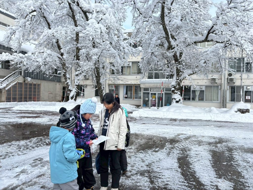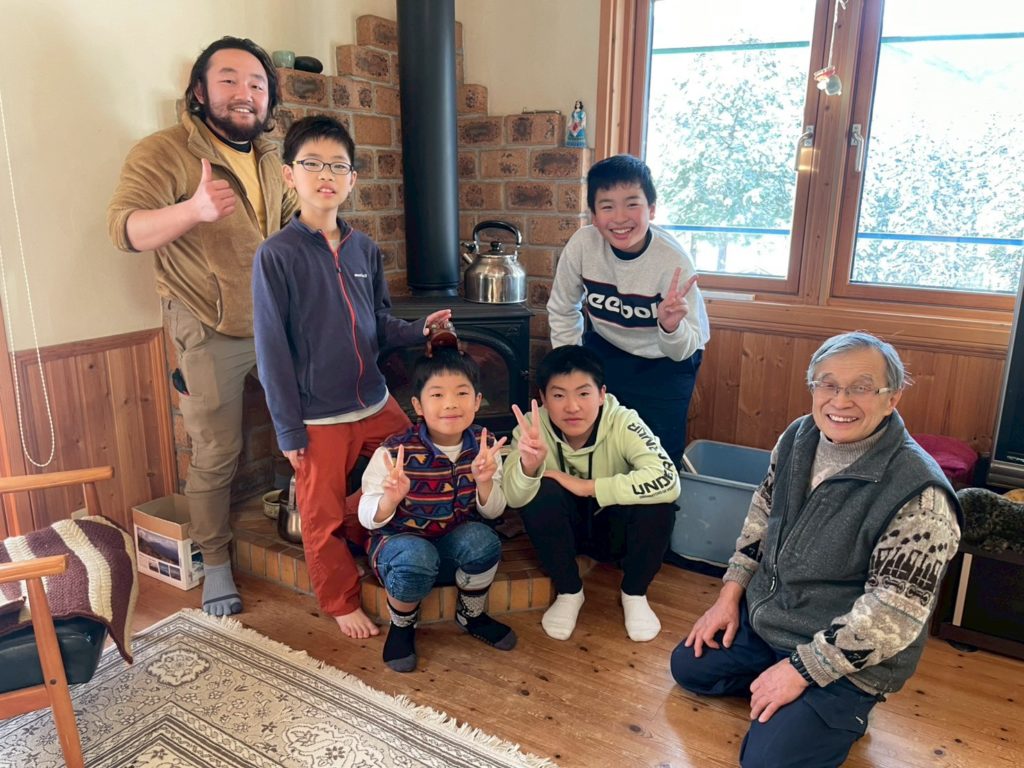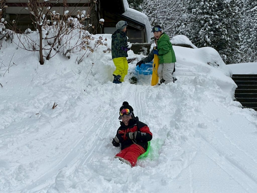 温かいお昼ごはんや薪ストーブで焼いた焼き芋をいただきつつ、午後は家の周りで雪あそび。