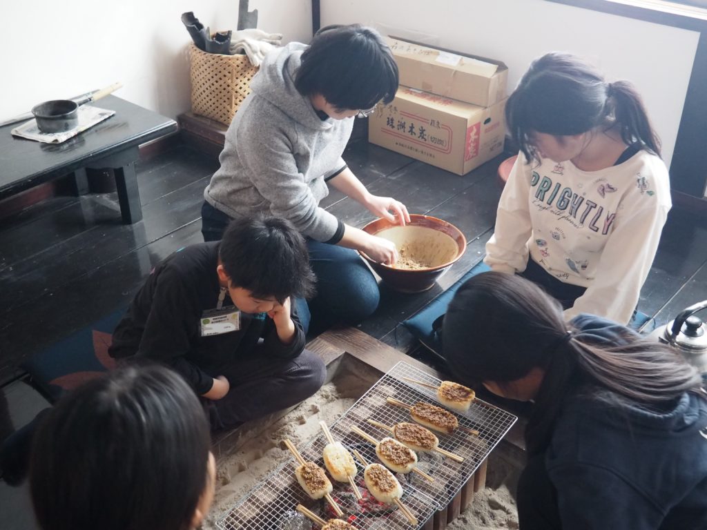 到着すると、お昼ごはんの五平餅を用意してくださっていました。えごま味噌を作り、一つ一つ塗っていきます。