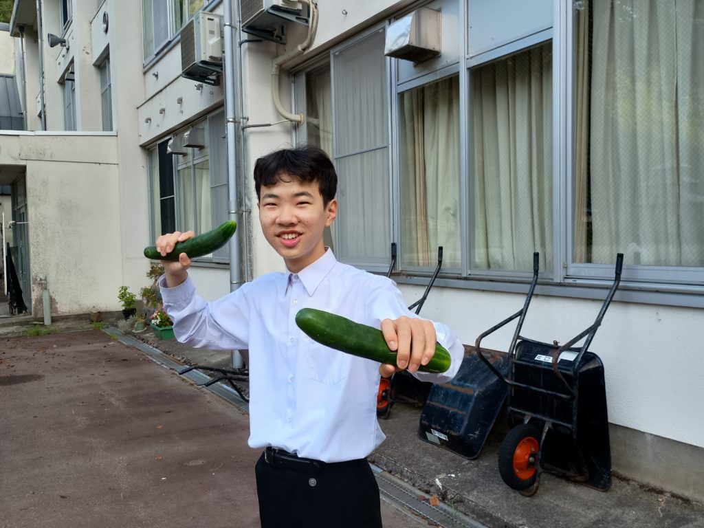 翌日の朝は夏休みの間に成長した野菜を収穫します。