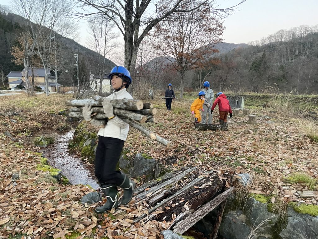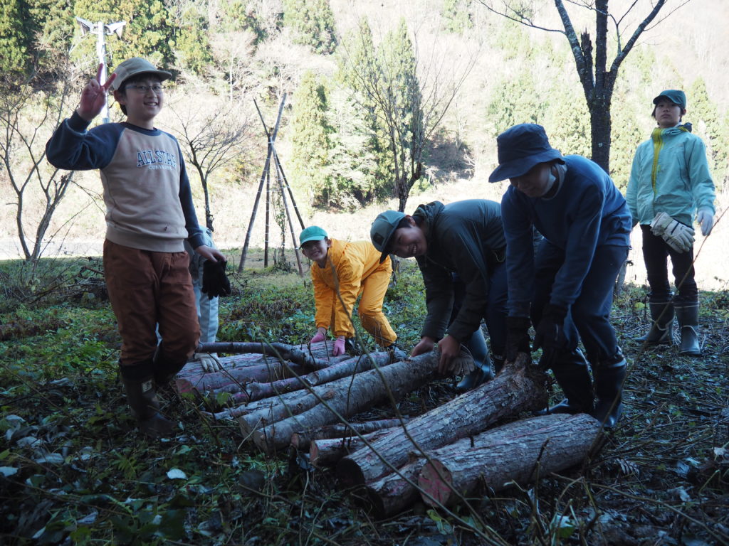 仕上げに枝打ち、玉切りをして、みんなで搬出!