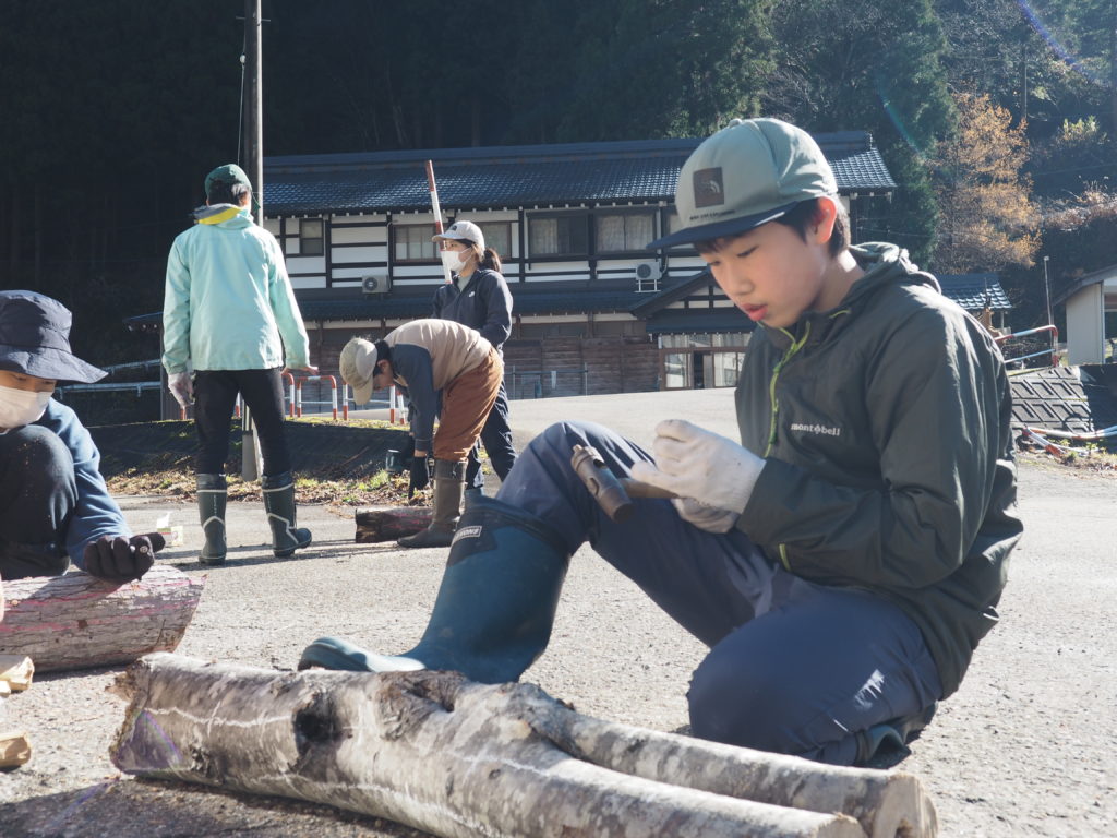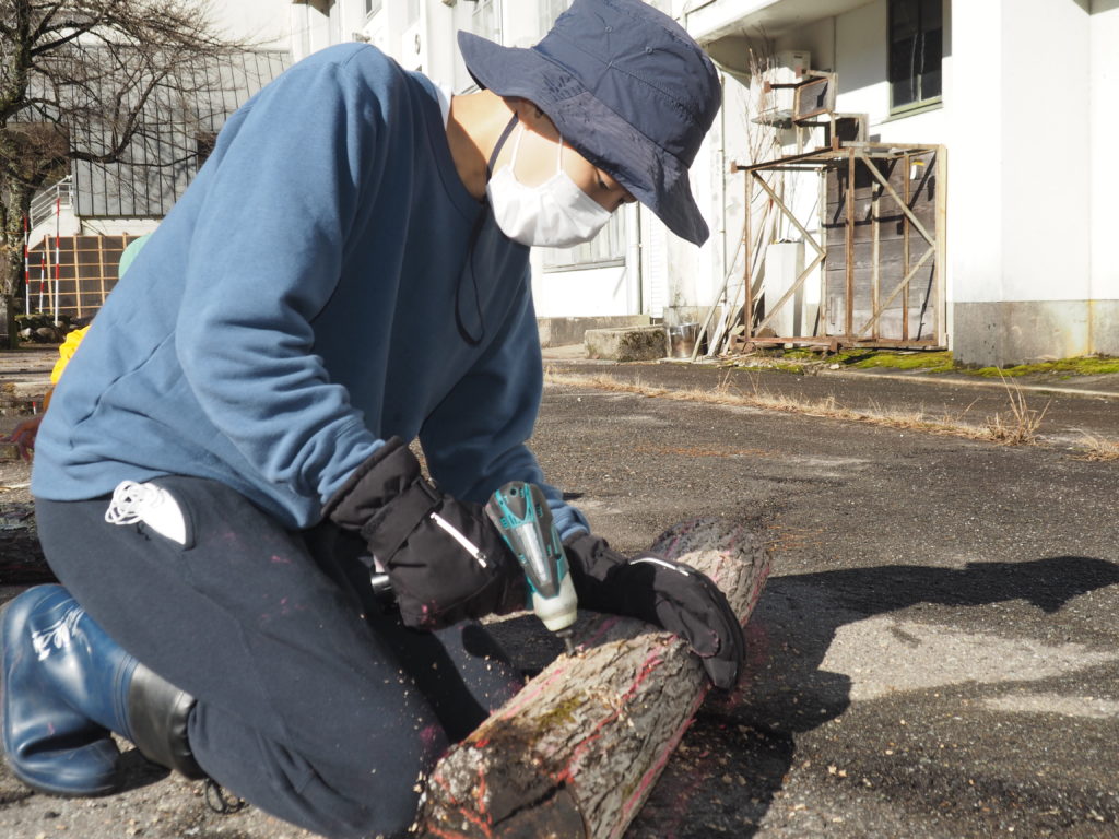 つぎに穴をあけて、菌を打ちます。ドリルだけでなく昔の道具にも挑戦。菌を打つ時の音が心地よかったです。