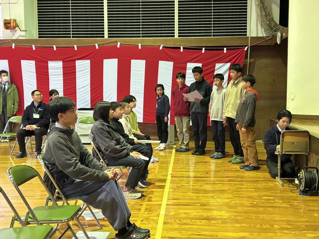 少し緊張しながらも、マンサクの花を持って笑顔で入場!来賓の方々や受け入れ家庭、地域の皆様、保護者の方々が見守る中、留学生がつどいの場を進行させていきます。